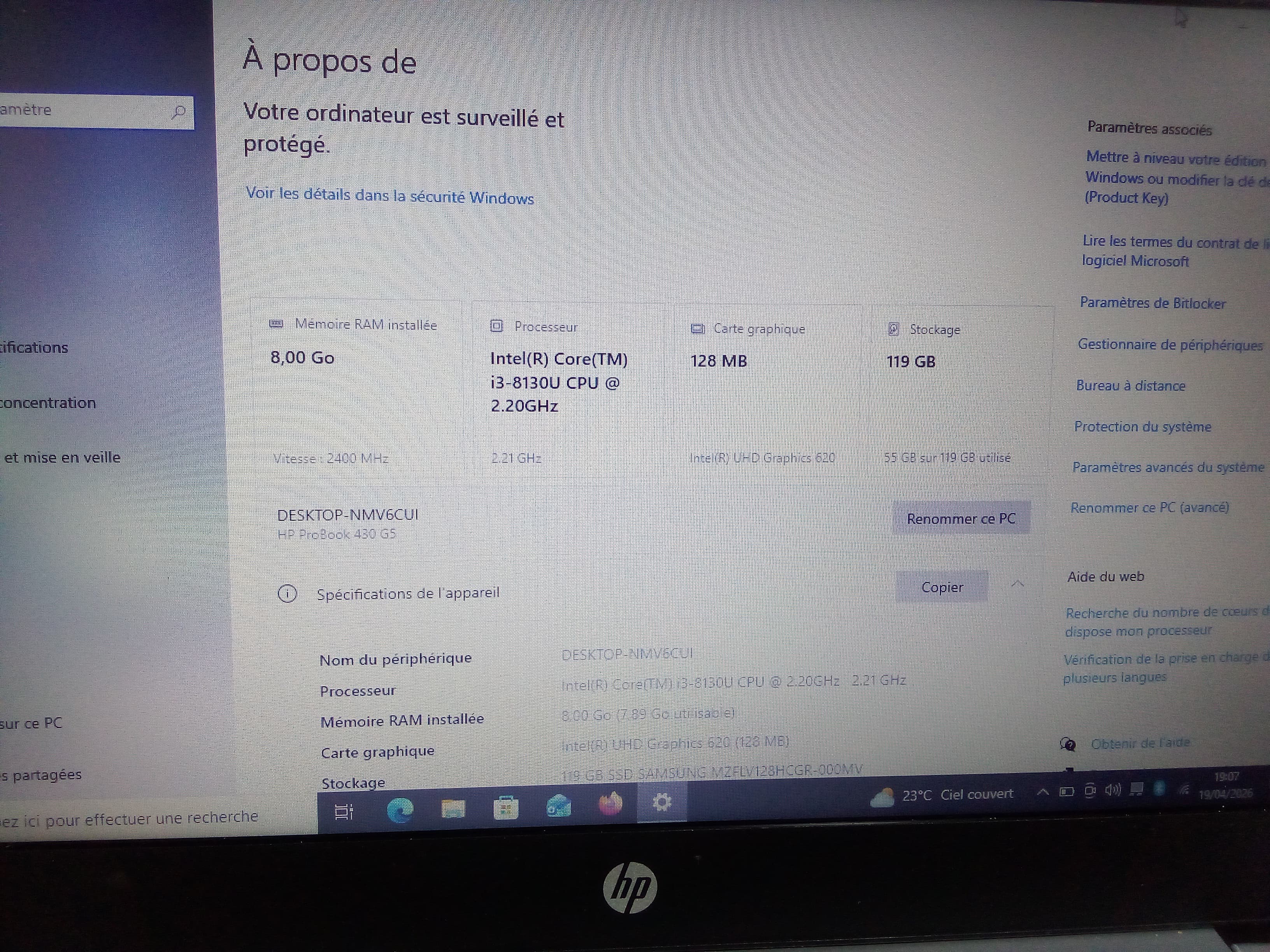 Pc Portable HP ProBook Écran 14 Intel Core i3 8eme Génération 8Go RAM 128Go SSD Stockage batterie 5H